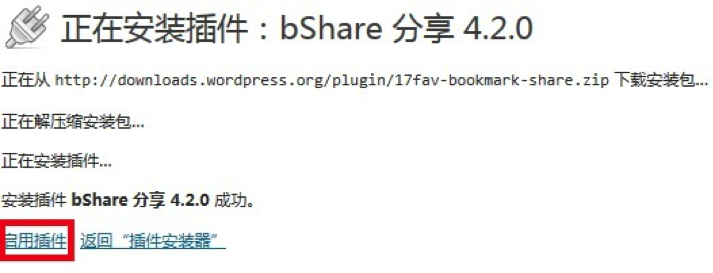 页面进入Wordpress官网,下载并安装bShare分享插件,直接点击“启用插件”。