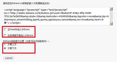 启用bShare分享工具后,可以对其显示位置进行设置。默认图标将在日志或静态页面正文后添加。