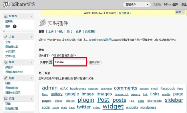 进入Wordpress后台,选择“插件”->“添加新插件”-> “搜索”功能,然后搜索关键词“bShare”。