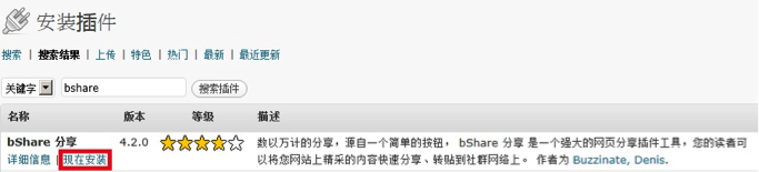 在搜索结果中,选择“bShare分享”插件,点击“现在安装”。