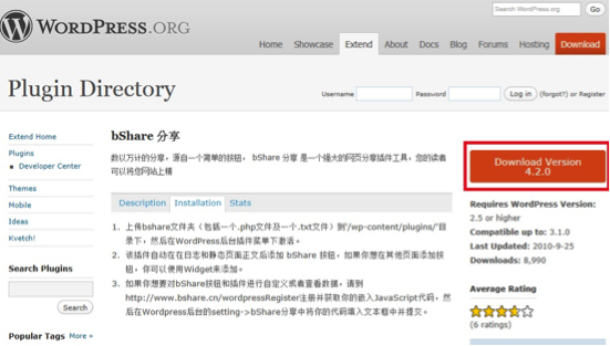bShare分享工具目前已正式进驻Wordpress平台,用户只需登陆Wordpress官网,即可下载bShare分享插件。
