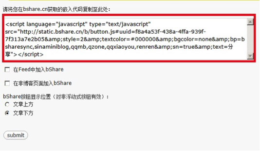 例如:您想在其他页面中也添加分享按钮,则可将您在bshare.cn获取的JS代码直接复制到“Wordpress后台”->“设置”-> “bShare分享”的文本框中保存。之后,您就、可以登录到bshare.cn上查看您博客的浏览、分享等数据信息。