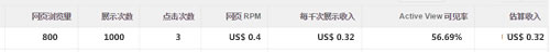 AdSense统计表格里,有7个指标,分别为:网页浏览量,展示次数,点击次数,网页RPM,每千次展示收入,Active View可见率,估算收入。如下图所示: